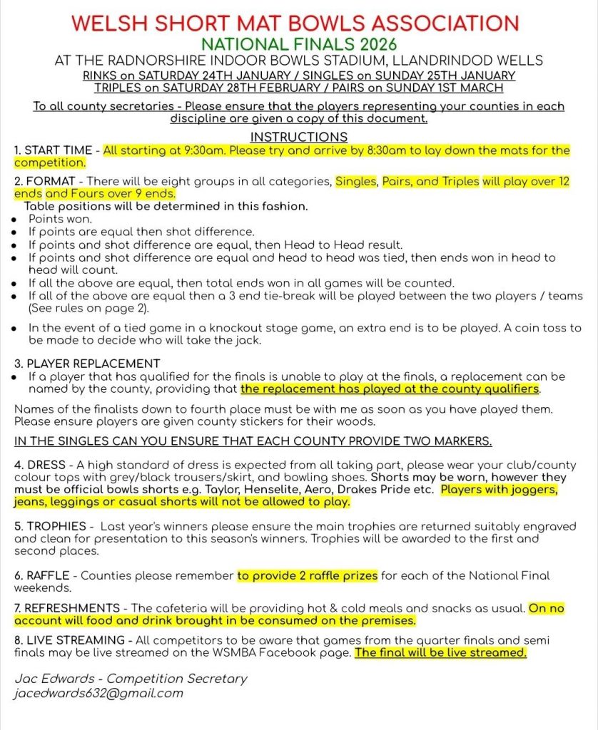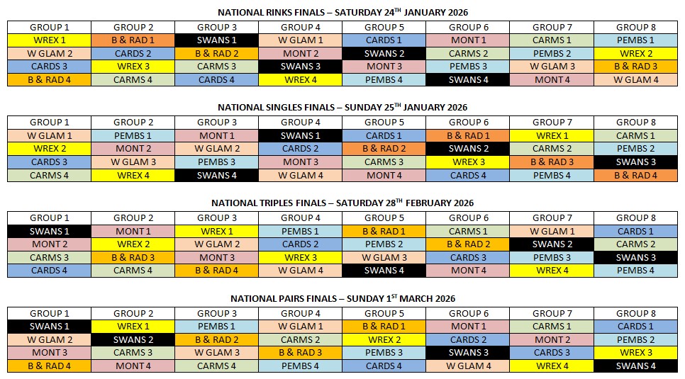2026 - Red Card Results Saturday 13th December 2025Brecon and Radnor Red Card Triples Results:-1st – James Ashcroft, Clive Lewis & Phil Lewis2nd – John Jillings, Mary Jane Rogers & Jason Rongione3rd – Louise Home, Richard Davies & Roy Price4th – Tony Morgan, Roger Morgan & Mike Hodgson Saturday 22nd November 2025Brecon and Radnor Red Card Singles Results:-1st – John Jillings2nd – Tony Morgan3rd – Roy Price4th – Chris Whittingham Saturday 1st November 2025Brecon and Radnor Red Card Fours Results:-1st – Henry Harley, John Davies, Daniel Davies & Jan Healey2nd – Jason Rongione, Ian Train, Philip Lewis & Clive Lewis3rd – Roy Price, Roger Morgan, Richard Davies & Mary Jane Rogers4th – Tracey McAdam, Tony Morgan, Chris Whittingham & Jan Maynard Saturday 18th October 2025Brecon and Radnor Red Card Pairs Results: –1st – Mary Jane Rogers and Jason Rongione2nd – Mike Hodgson and Roy Price3rd – Trevor Mines and Tal Short4th – Clive Lewis and Philip Lewis Below is the draw for this years national finals (from the above results 1st = B & RAD 1 to 4th = B & RAD 4). Competition Rules
